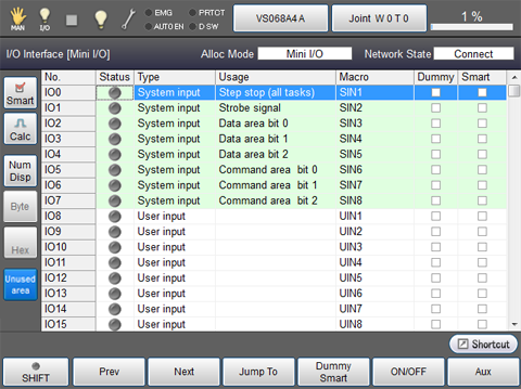 | [F3 Jump To] | Displays numeric keypad. Enter I/O number with numeric keypad, and press [OK] to move to the target I/O number. The selected I/O number will be highlighted. This can be also selected by using jog dial or up and down cursor keys on the tech pendant. |