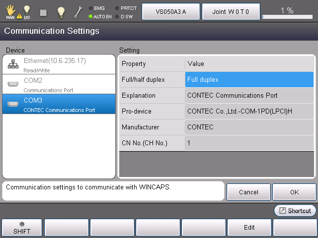 Set the permission and IP address for communications through Ethernet between WINCAPSIII and the robot controller. Also, specify the full/half duplex setting for serial data communications.