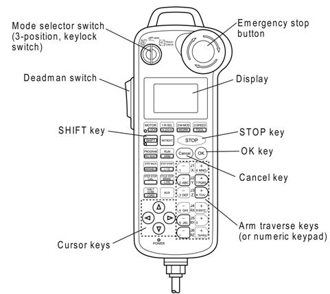 The mini-pendant is an entry/operation device for operating the robot manually, starting programs, and teaching. It has no programming function.