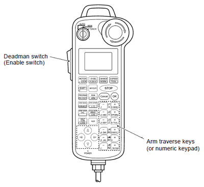 The teach pendant and mini-pendant have a deadman switch(es) each. Holding down the deadman switch properly activates some functions in Manual mode or Teach check mode.