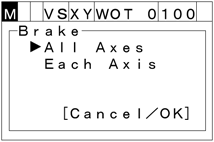 Choose the axis to be set with the up and down cursor keys and press [OK] to display the "Brake control screen".