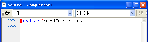 A Source Code Edit window is for specifying the events to take in response to a CLICKED, RELEASED, or other state change event associated with the corresponding part on the panel layout.
