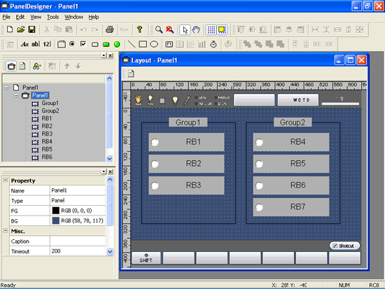 Place two groups with three and four radio buttons respectively on the panel layout.