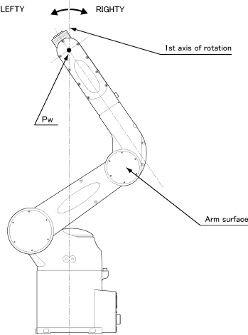 When viewed from the normal line on the side of the arm link, if point Pw exists in the left-hand side of the rotary axis of the 1st axis, the figure is LEFTY; if point Pw exists in the right-hand side, it is RIGHTY.