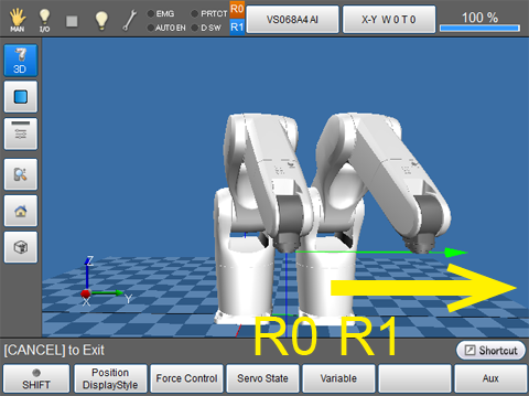 To move the leader robot to the +Y direction, with the deadman switch on the teach pendant pressed, on the Arm traverse key area, press "+" button on the J2/Y.