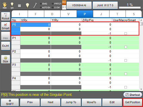 On the bottom of the Get Position window, you will find a small square button written in either "P" or "J". Once you press the "P" button, it turns to the "J" button, and conversely. When the button is "J", the position information of extended-joints are displayed.