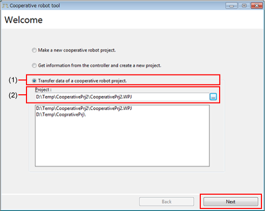 Select (1) Transfer data of a cooperative robot project, and then specify a project for the master robot in the text box of (2) Project.