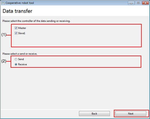 As the following figure shows, (1) select robots you want to send/receive data, and then (2) select "Send"(PC to RC8 series) or "Receive" (RC8 series to PC).