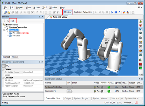 Turn ON Monitor button. With EMU teach pendant, execute a program that you want to simulate.