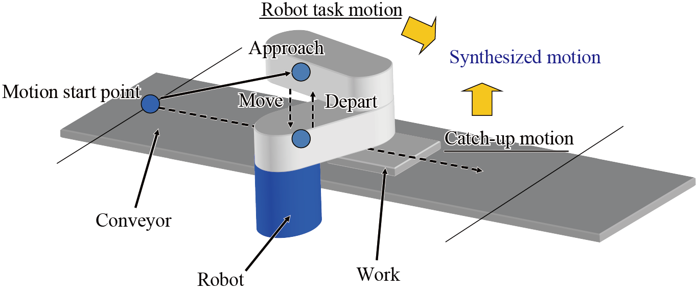 For example, a TrackApproach motion is a synthesized motion of the conveyor catch-up motion and Approach motion. In this context, Approach motion corresponds to the robot task motion.