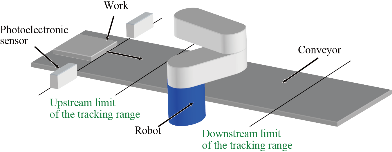 Tracking range is delimited by the upstream limit and the downstream limit. The upstream limit is set to the direction where a workpiece comes from, whereas the downstream limit is set to the direction where a workpiece goes to. To use multiple robots, set a tracking range for respective robots.