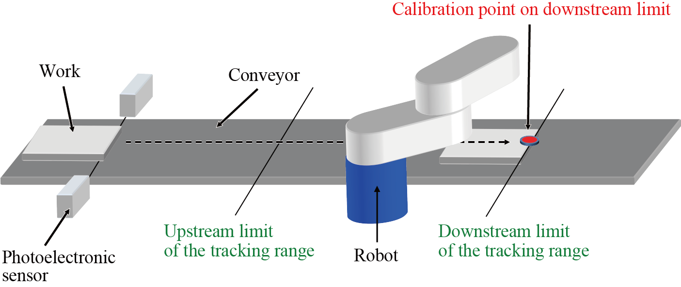 - This is the tracking limit on the upstream of the conveyor. Once a workpiece passes this limit, a robot starts the conveyor catch-up motion.