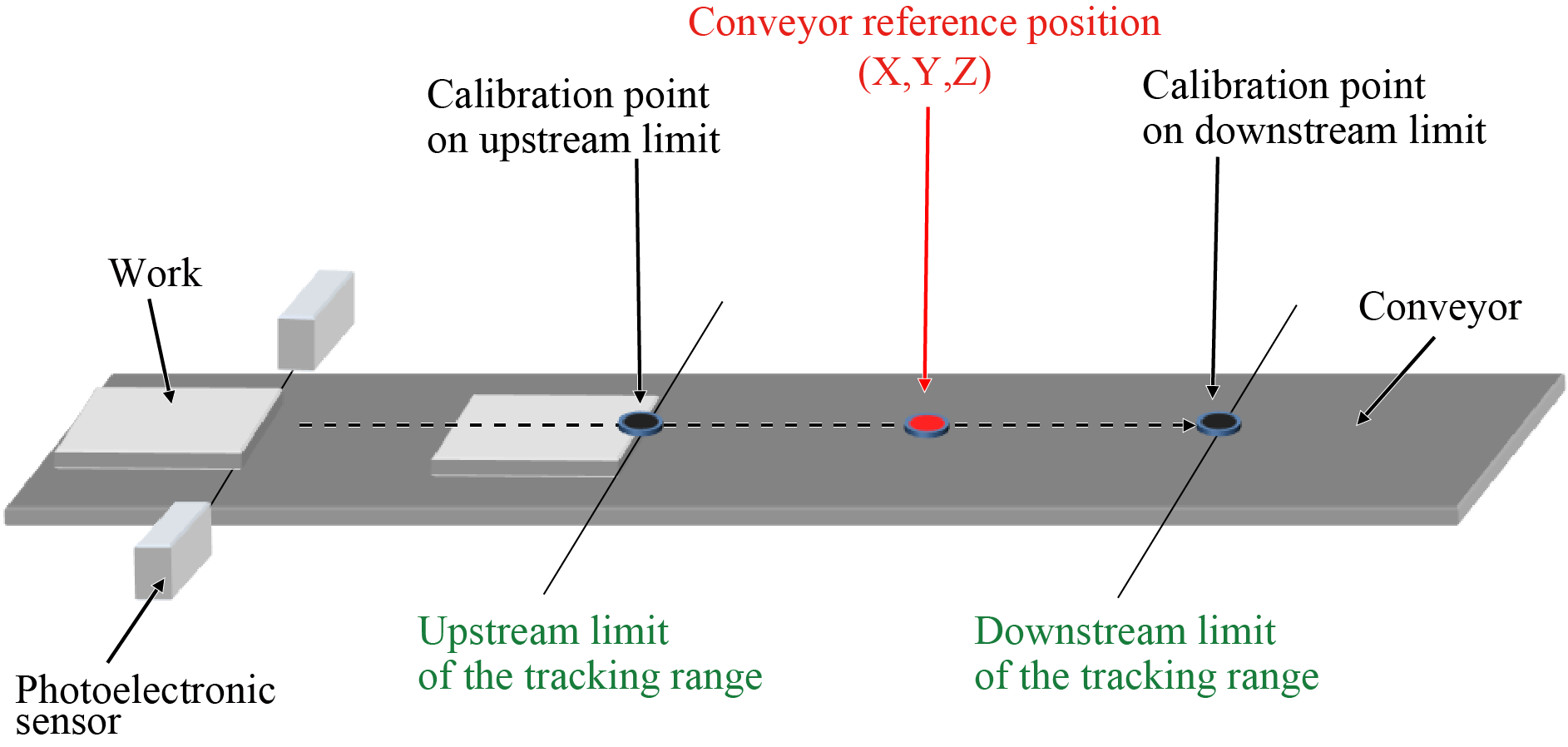 - In the conveyor tracking of RC8 series, conveyor calibration means measuring the exact positional relationship between the conveyor and robot. Specifically, it means measuring the following parameters.