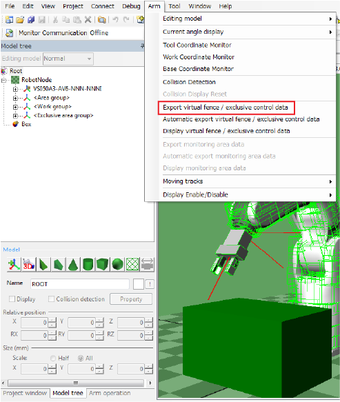 You can check the exported virtual fence data by selecting the menu [Arm] - [Display virtual fence / exclusive control data].