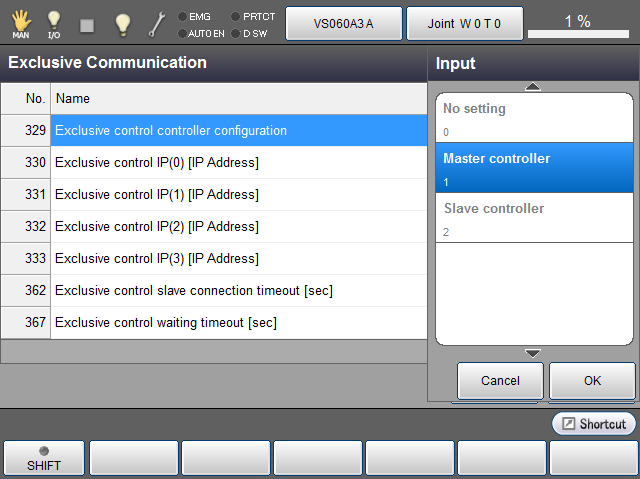 Set a robot controller as a master or slave controller. 0 : No setting 1: Master controller 2: Slave controller |