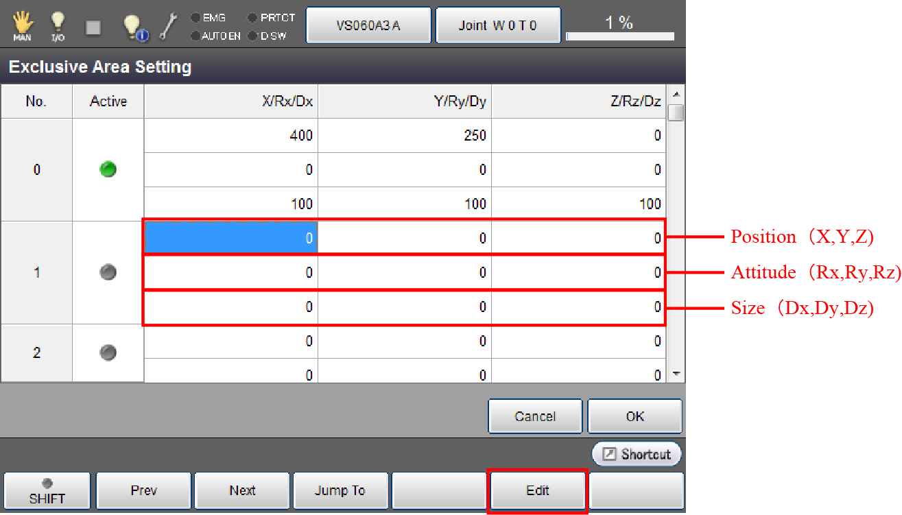For an area number you want to add an exclusive model, enter each element (X, Y, Z, Rx, Ry, Rz, Dx, Dy, Dz). To change the value, select an element and then press [F5: Edit]. Change the value with the ten key, and then press [OK] to confirm.