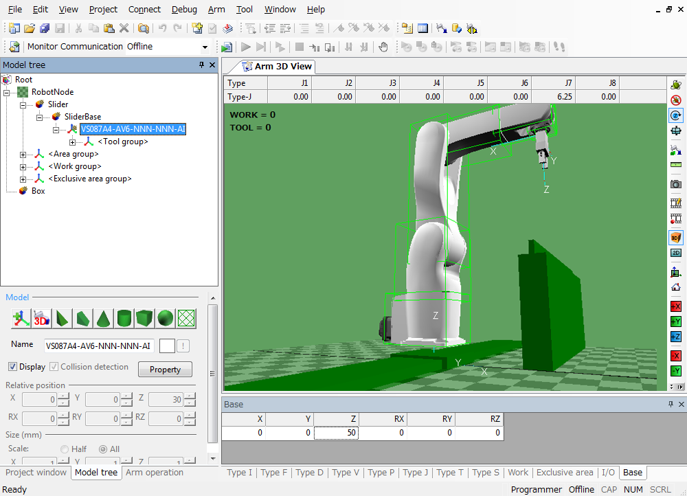 To put the robot model on the SliderBase, the robot position on the Z-direction needs to be changed. Since the relative motion of the robot model is impossible, change the base coordinate.