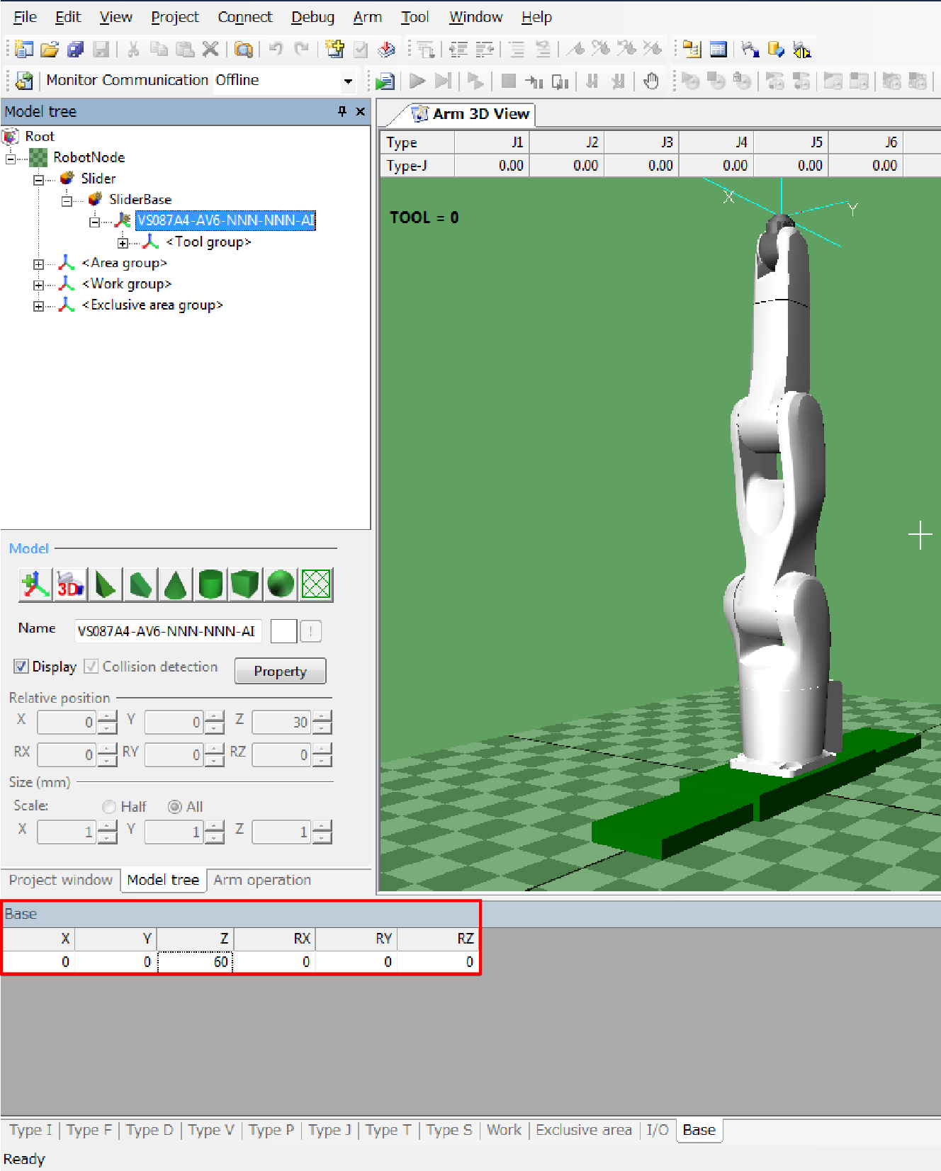 Press [Move arm node] to move the robot model to below the SliderBase.