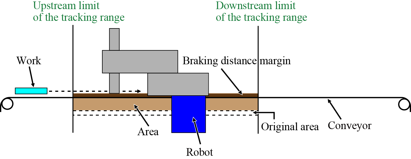 Please pay attention to avoid collisions with equipments placed behind the Downstream limit of the tracking range. It is recommended to perform collision check by using Area function to prevent unintended contact between robot and equipments.