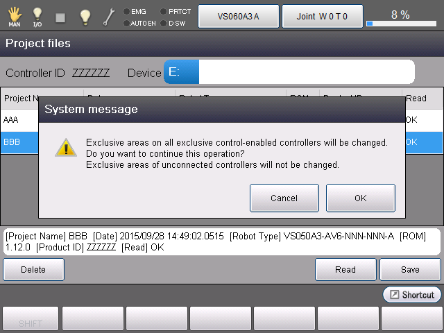If you selected [Arm coordinate], a warning dialog appears before the data is read.Press [OK], and the project stored in the USB memory will be read. When reading the project has been completed, reboot the controller.