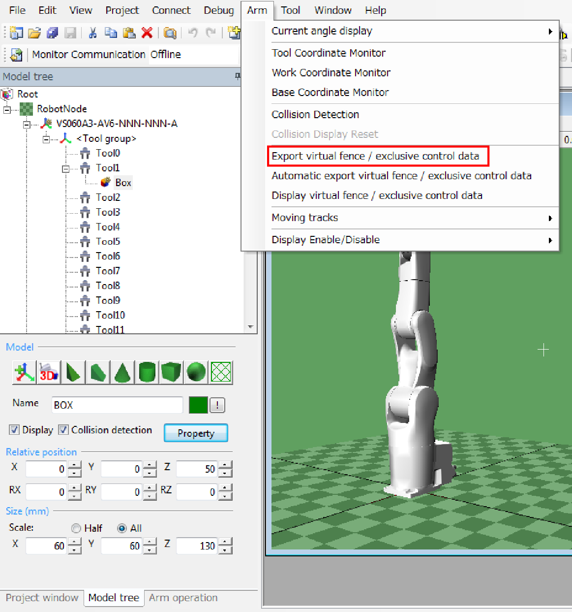 [Menu] - [Arm] - [Export virtual fence / exclusive control data]