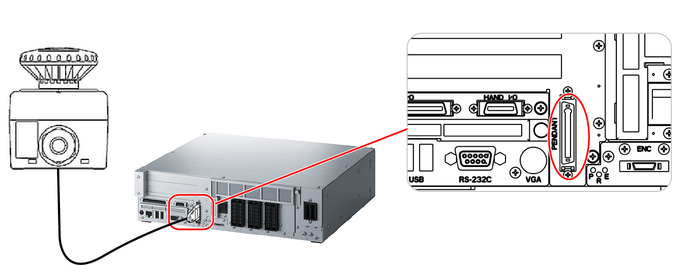 Connect emergency stop switch box to PENDANT connector of robot controller as shown in the figure below.