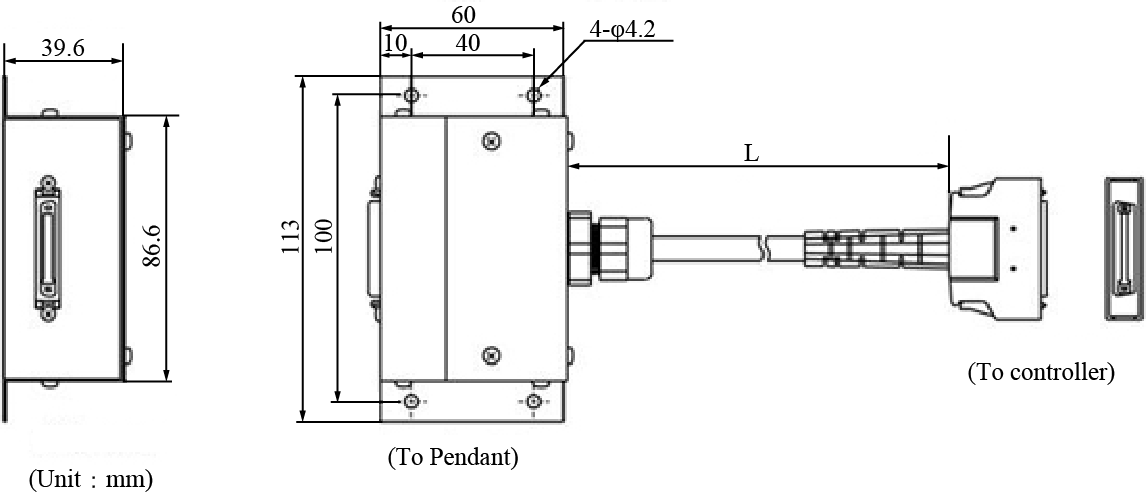 You can use a pendant extension cable (option) as an extension cable for the emergency stop switch box. The external view is shown in the figure below.