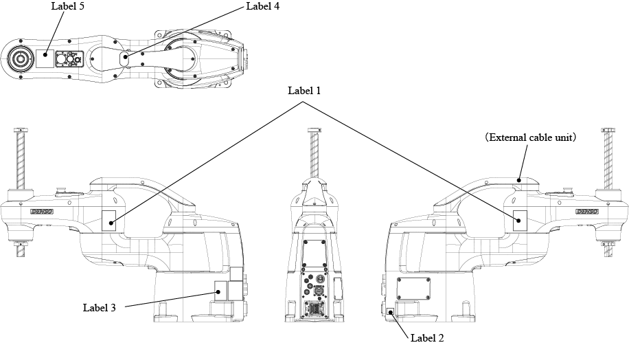 The robot unit has warning and caution labels pasted as shown below. They alert the user to the dangers of the areas on which they are pasted. Be sure to observe the instructions printed on those labels.