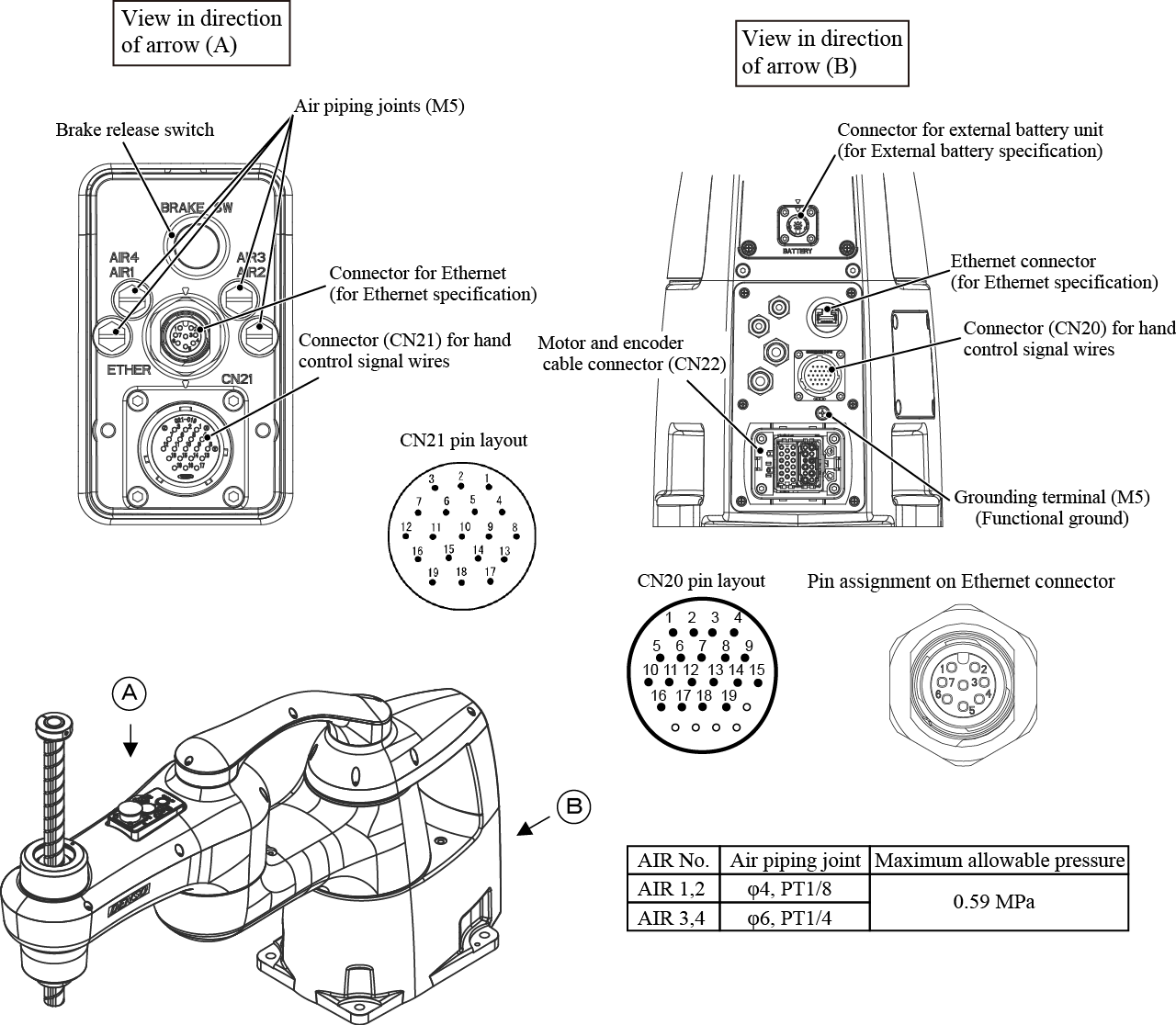 Note 1: Pins #1 to #19 on CN21 and those on CN20 are connected with each other. The maximum rated current per line is 1A. Note 2: Use the attached connector set for CN20 and CN21. |