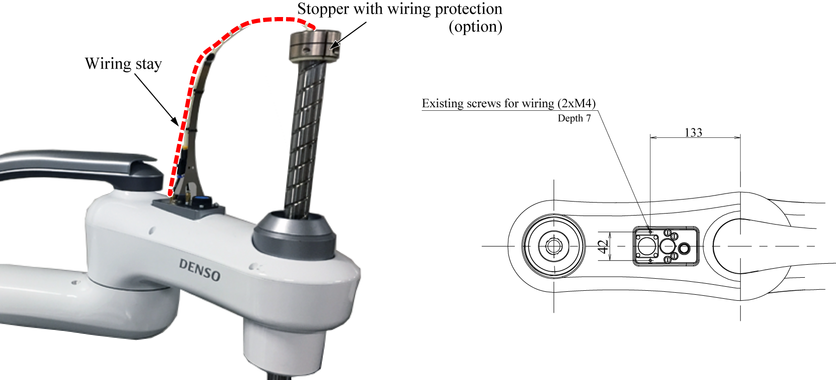 When mounting a stay that clamps wiring and piping to the robot unit, fix the stay with the two existing screw holes that are located on the arm connector plate of the second axis.