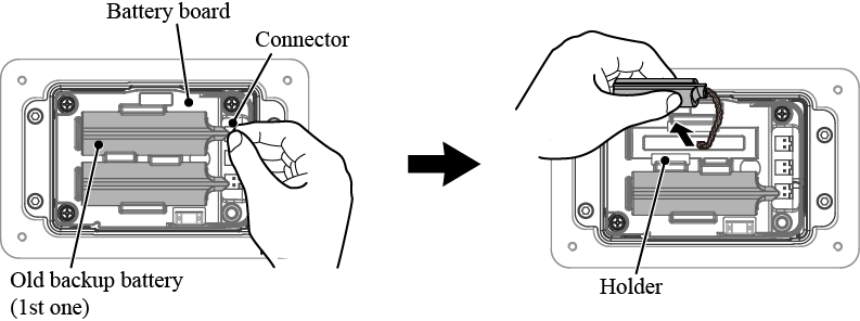 Connect a new battery (1st one) to the battery board from which you have disconnected the old one in Step 4, and then load it into the holder.
