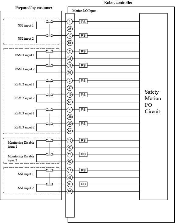 - Two RSM N input signals (N represents a number from 0 to 3) must be controlled with separate contacts. Two RSM N circuits connected in parallel using a single contact or always-shorted circuit will be interpreted as an external circuit failure, as a result, the robot cannot start operation.