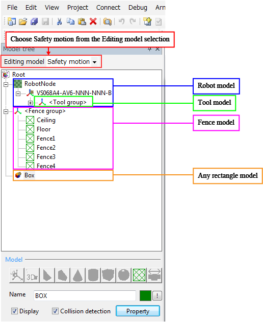 | Temporary | Any rectangle model | Monitors the contact with the monitoring target. To monitor whether if the monitoring target is away from a certain peripheral device, set the size of rectangle model equal to or larger than the outer diameter of the peripheral device. This restricted area can be enabled/disabled by switching Monitoring area N disable input (N represents a number from 0 to 3). |