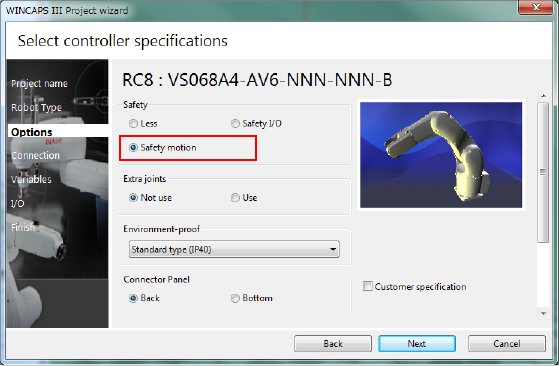 In the WINCAPSIII Project wizard, on the [Select controller specification], select [Safety motion].