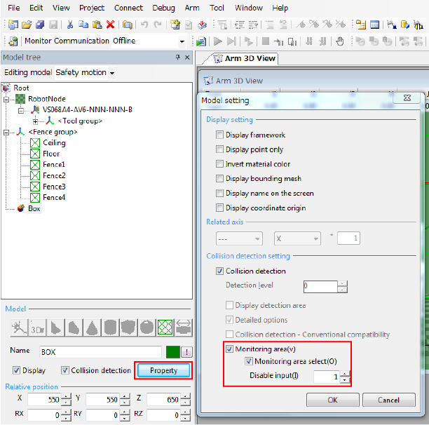 Click [Property] to open [Model setting] window. On the [Model setting] window, set items in the [Collision detection setting] pane.