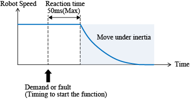 The robot starts moving under its own inertia. The time and distance that is required to complete stop of robot depends on the system's dynamic mechanism and the motion energy.