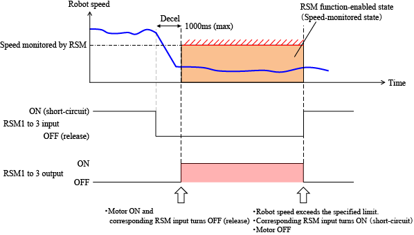 ・RSM1, RSM2, and RSM3 outputs turn OFF when the robot speed exceeds the specified limit.