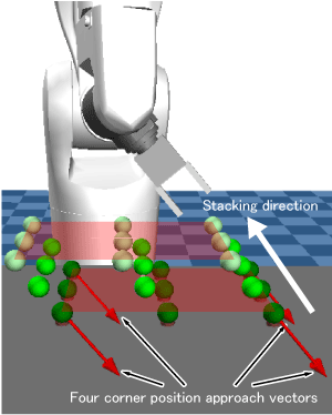 For example, when the four corner position approach vectors face in the vertically downward direction to the XY plane of the base coordinates, the height of one stack increases in the vertically upward direction from the XY plane (Example 1).