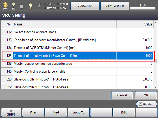 Before connecting, adjust a value of No.135 [Timeout of the slave robot (Slave Control)] from the VRC setting window. Recommended setting value is 1000[ms].