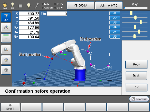 Trajectory from the current robot stop position to the changed start position of the Home Position Guidance is not generated based on the control log. Therefore, interference with peripheral devices is not guaranteed.