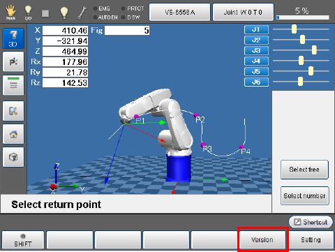 When you press F5 [Version] in the Select return point window, you can check the version of the Home Position Guidance path calculation software of IPC set for RC8 extension function.