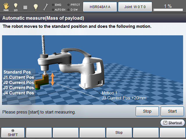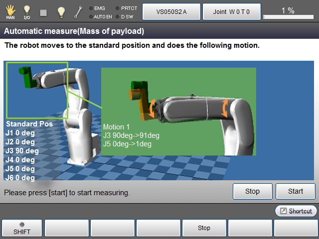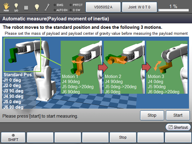 - When performing automatic measurement, be sure to execute measuring in the order of Mass of payload → Payload center of gravity → Payload moment of inertia. If performs in a different order, it may result in incorrect measurement values.