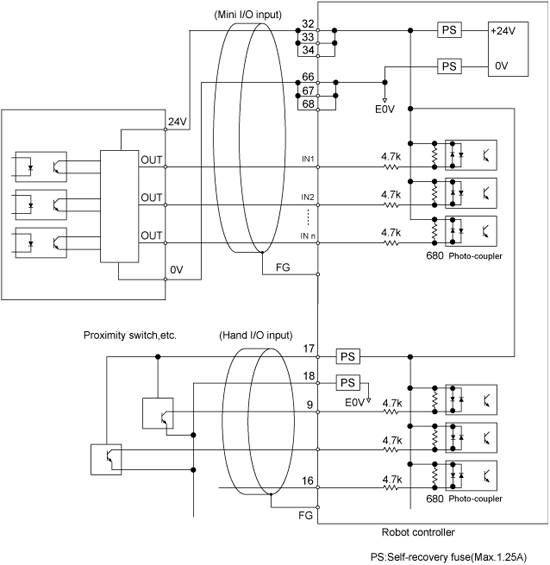 The figure below shows examples of the user-input, system-input and hand-input circuit configurations and connections of the robot controller.