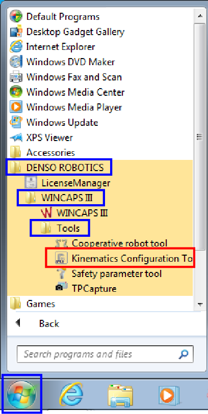 Operation path: PC [Start ] button - [All Programs] - [DENSO ROBOTICS] - [WINCAPSIII] - [Tools] - [Kinematics Configuration Tool].