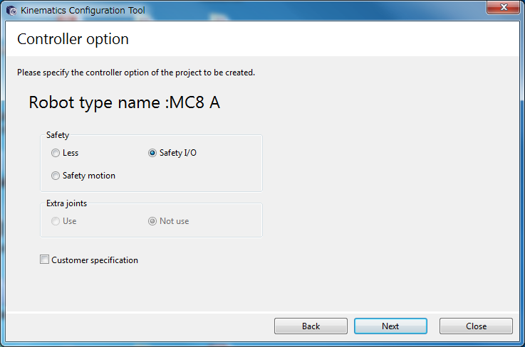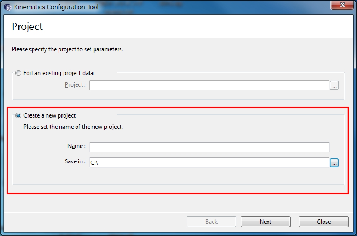 If you use Kinematics configuration tool after [Setting Each Axis], receive the controller project to WINCAPSIII, and save it; then, choose [Edit an existing project data] at the step of Kinematics Configuration Tool.