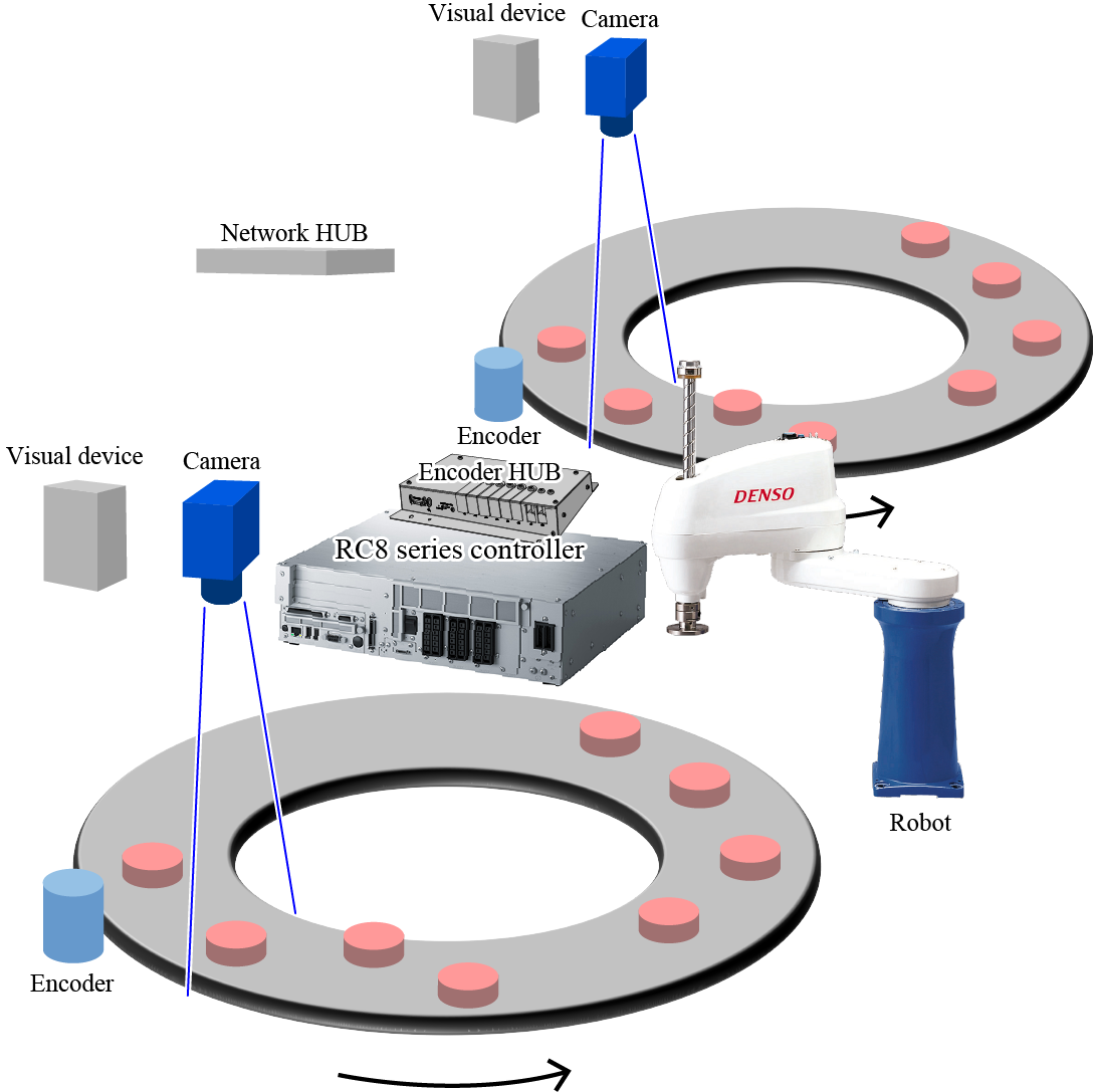 Configuration of the Circular Tracking System with Two Turntables and One Robot