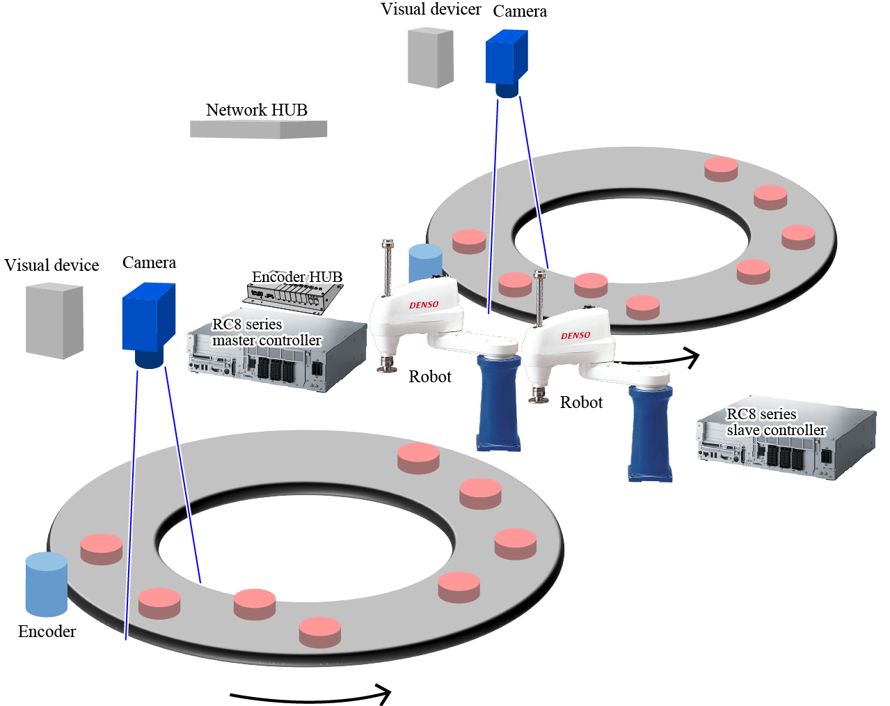 Configuration of the Circular Tracking System with Two Turntables and Two or more Robots