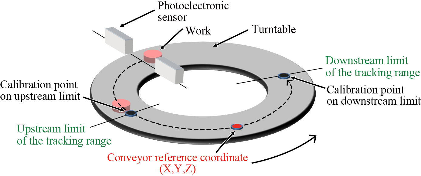 | Upstream limit of the Tracking range | Once a workpiece passes this limit, a robot starts the catch-up motion. [mm] |