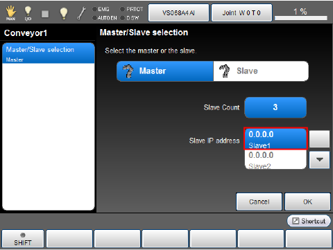 If you operate with two or more robots, you need to setup both a master controller and a slave controller, respectively.