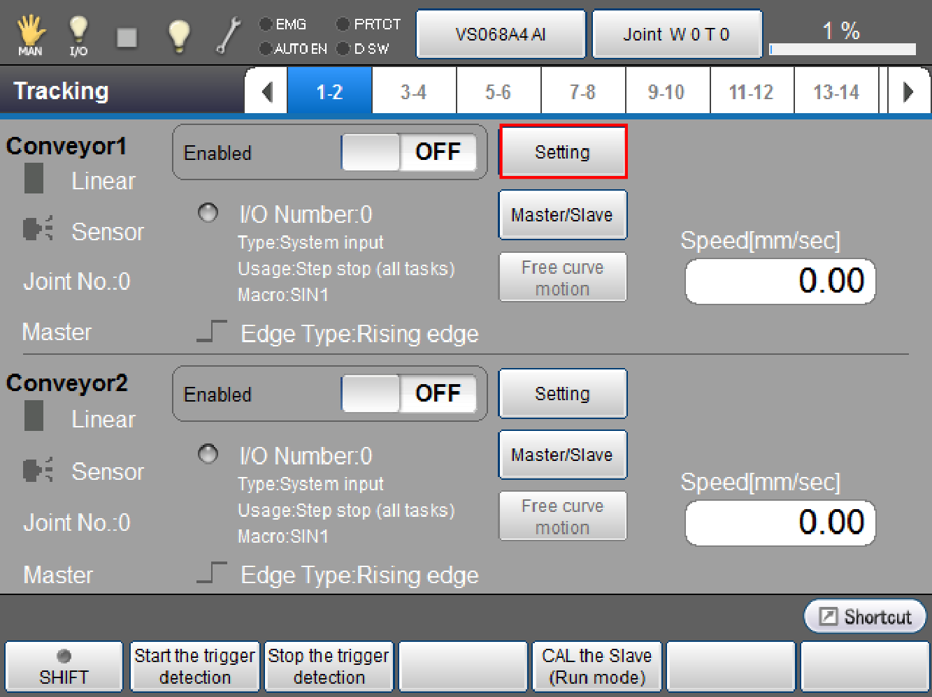 When you use the dual arm control function, to set a dual arm-controlled robot as a master, enter the robot number that you want to run as a master of the conveyor tracking operation. If the dual arm control function is not used, leave this entry as 0.